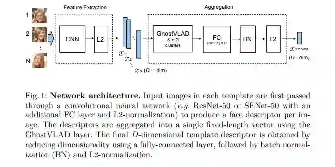 多幅人脸图像(每次图像个数可不同)通过CNN网络提取特征并L2归一化,然后被送入聚合模块,GhostVLAD网络模块将多个人脸特征聚合称固定维数的特征矩阵(与输入图像个数无关),再通过全连接层FC、BN层和L2归一化为紧凑鉴别的特征。