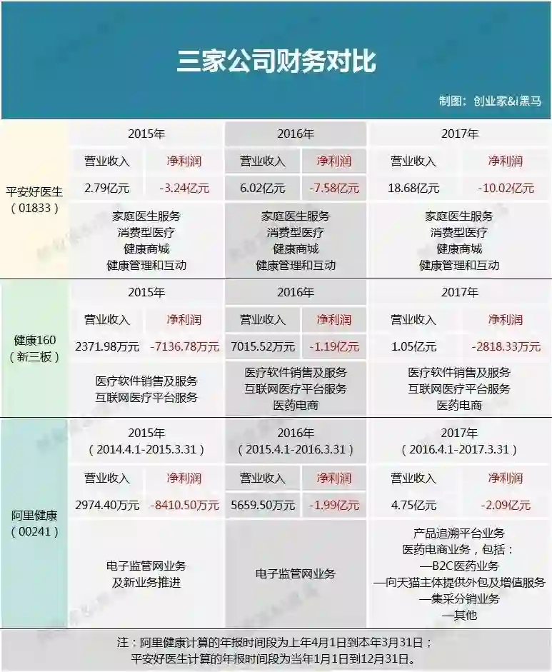 再比如,同在香港上市、目前与平安好医生有较大竞争业务的阿里健康来说,它2015初才上线预约挂号功能,2016年下半年才开始发展医药电商业务,但2017财年内也亏损了逾2亿元。