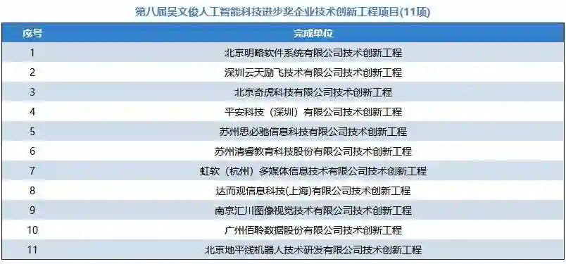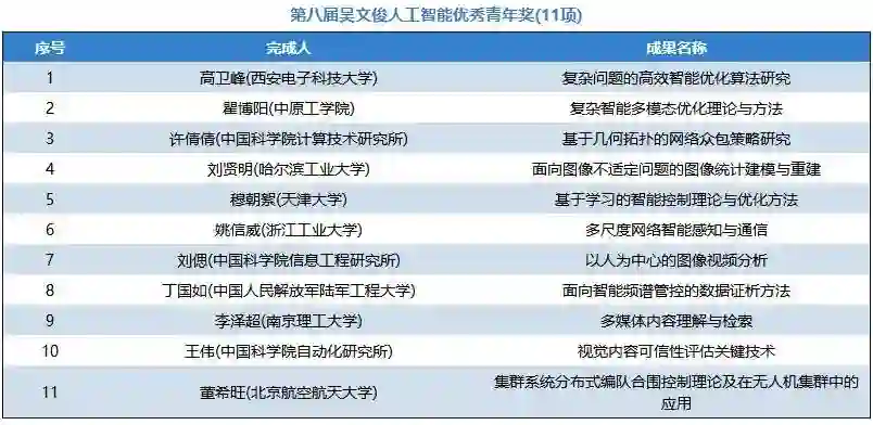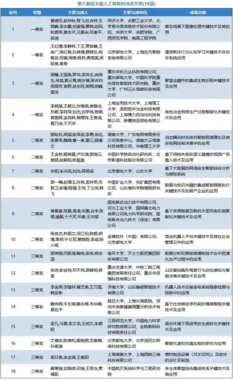 为加快实施国家创新驱动发展战略,深入贯彻《新一代人工智能发展规划》,更好地推进科教兴国、人才强国的政策落实,弘扬“尊重劳动、尊重知识、尊重人才、尊重创造”的良好风尚,通过推选优秀的智能科学技术成果及应用项目,充分调动和激发广大智能科技工作者投身建设创新型国家的积极性和创造热情,大力提升我国智能科学技术与产业应用的创新发展水平,隆重表彰在智能科学技术领域取得重大突破,做出突出贡献的单位和个人,根据《吴文俊人工智能科学技术奖励条例实施细则》规定,经各相关地方人工智能学会,全国各高校及科研(院)所、学会专委会和工委会及院士专家提名、推荐和申报,2018年9月-10月,中国人工智能学会邀请李德毅院士、谭铁牛院士、吴朝晖院士和陆建华院士和29位杰青、长江学者等专家组成评审委员会,经过初评、终评答辩和公示,第八届“吴文俊人工智能科学技术奖”共评出70个获奖项目成果,包括吴文俊人工智能最高成就奖1项(属提名制不参与公示),吴文俊人工智能杰出贡献奖1项,吴文俊人工智能自然科学奖14项,吴文俊人工智能技术发明奖13项,吴文俊人工智能科技进步奖18项、吴文俊人工智能科技进步奖企业技术创新工程项目11项、吴文俊人工智能科技进步奖科普项目1项,吴文俊人工智能优秀青年奖11项。其中,在70个获奖项目成果中,囊括有 56个高校的项目成果(包括两所军队院校)、48个企业的项目成果和7个研究院所的项目成果。中科云丛、平安科技、汇川科技、易华录、云天励飞、明略数据、奇虎360、虹软、兖矿集团、浙江远传、金碟软件、思必驰、影谱科技、地平线、山东鲁能、清睿教育等人工智能企业在本届吴文俊人工智能科学技术奖中崭露头角。