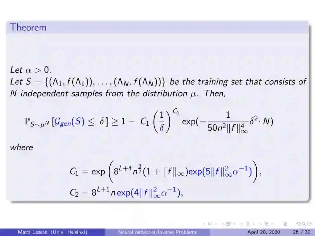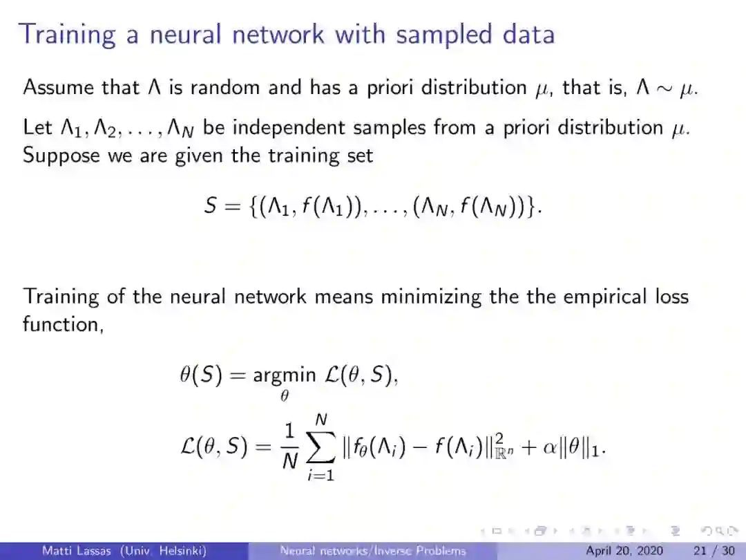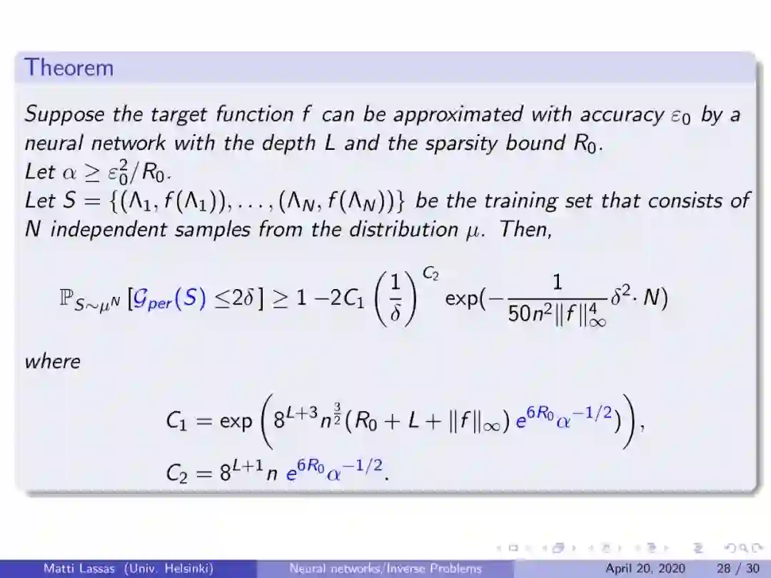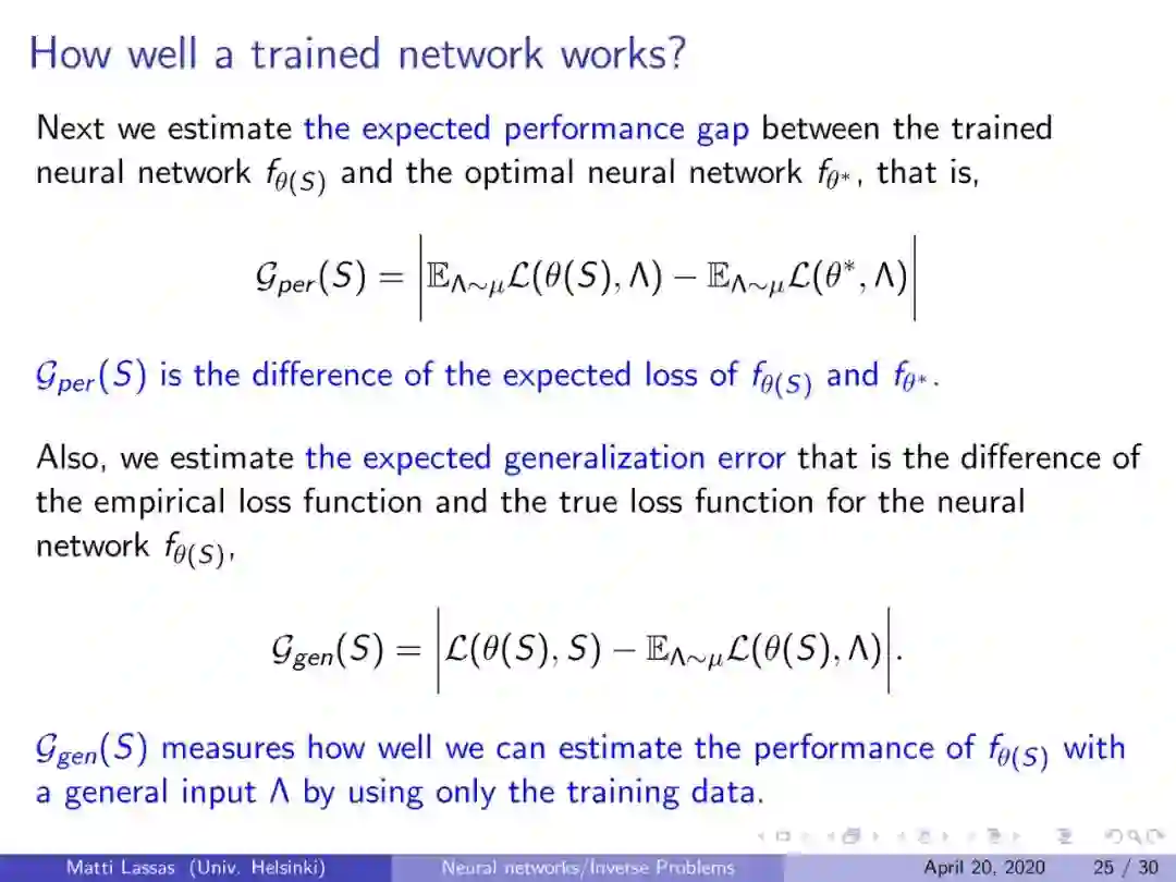 对于逆问题,主要的理论问题涉及逆问题的唯一性、范围特征、稳定性和正则化策略。我们将讨论当一个解算法从训练数据中推广时的问题,也就是说,当用有限数量的样本训练的解算法可以用训练数据中不包含的新输入来解决问题时。这可以看作是一个经典的逆问题的一个新的问题,它的动机来自于机器学习。