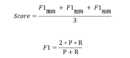 提交结果与实际渔船作业类型结果进行对比,以3种类别的各自F1值取平均做为评价指标,结果越大越好,具体计算公式如下: