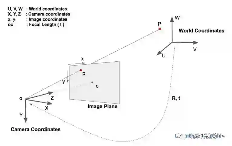 于是世界坐标系(UVW)、相机坐标系(XYZ)、图像中心坐标系(uv)和像素坐标系(xy)四兄弟闪亮登场。如果相机完美无瑕,老三可以回家洗洗睡觉,关系也相对简单。