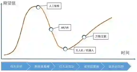 我用一个反映期望值高低的Gartner公司的曲线来说明前沿科技的发展现状。具体来讲,万物互联或物联网实际上已经走出发展低谷,进入到我们称为“理性的爬坡”的发展阶段。我们所投的公司中也有一系列物联网领域的创业公司,比如我们投资的两家公司针对非常小众的智能硬件产品视频门铃,一家是我们在中国投资的这一领域市场份额最大的移康,其销售额已经达到上亿人民币,另一家我们在美国投资的也是这一领域市场份额第一的Ring,销售额达到数亿美金。这两家公司经过四五年的发展,都实现了盈利,并且有着非常健康的发展趋势。在智能可穿戴领域,我们投过的手环公司Fitbit也已经成功上市。但整体而言,曾经非常火爆的智能可穿戴领域的大部分公司都处于发展低谷,还没能进入到“理性的爬坡”阶段。