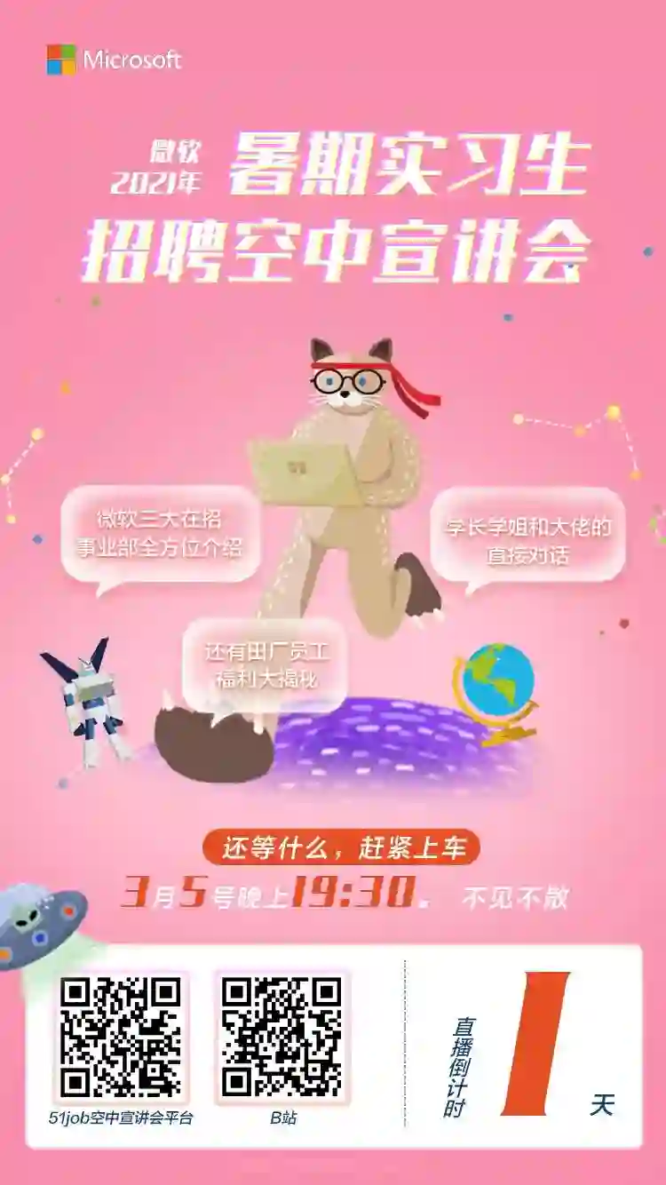 微软2021年暑期实习生招聘空中宣讲会丨直播倒计时1天