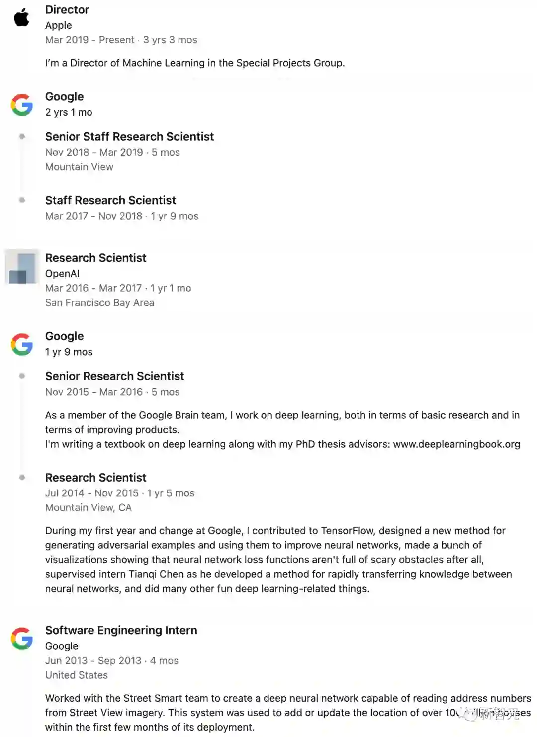 谷歌大脑研究科学家、苹果的机器学习总监、GAN的发明人、「花书」作者之一,任何一个头衔都是金光闪闪。