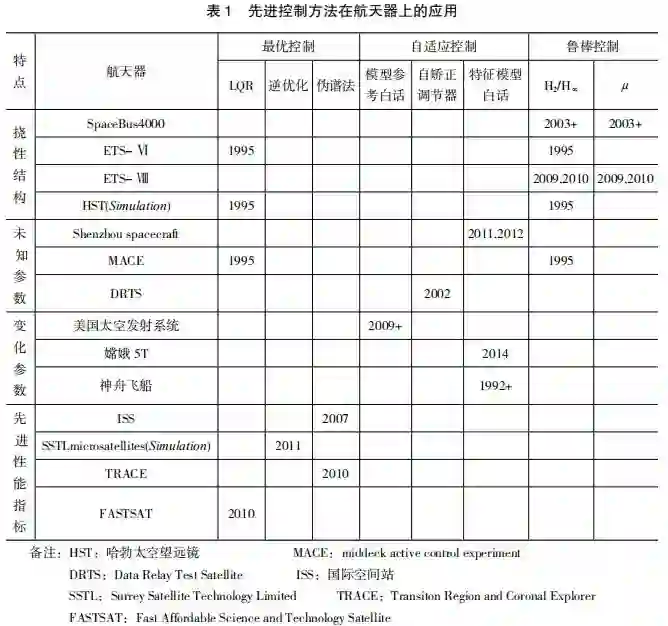 围绕高指向精度和快速机动能力两方面需求,先进控制理论在航天器上的应用主要面临航天器挠性、未知参数大范围变化、未知参数快速变化、以及日益提升的性能需求。与此同时,缺乏精确的对象和环境模型,以及缺乏充分的地面物理实验,是制约先进控制方法在实际工程应用的核心难点。值得欣慰的是,在航天器对先进控制方法迫切需求的发展趋势下,国内外始终有一些学者和工程师们致力于将先进控制方法引入航天器的控制系统中。参考文献[2]分析总结了当前先进控制方法在航天器上的应用现状,特别是那些已经得到了在轨验证的先进控制方法。相关分析统计结果如表 1 所示。从表 1 中,我们可以看出对于几类典型航天器,先进控制方法的适用范围具有如下规律: