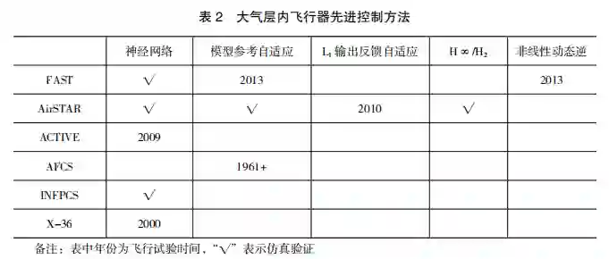 从表 1 我们可以看出,以美国为首的航天强国,一直非常重视先进控制方法在航天器上的应用,重点围绕模型参考自适应控制、H∞/H2 鲁棒控制以及神经网络动态逆控制三类方法开展工程研制和飞行试验,针对几类典型对象,已经取得了若干套稳定且实用的先进控制系统设计方法。特别地,针对大气层内飞行器,美国非常重视其智能飞行控制系统的研制。目前 NASA 已形成若干套成熟的先进飞行控制平台,包括 FAST 测试平台[35],AirSTAR 测试平台[36]、ACTIVE 测试平台[37]、AFCS 控制系统[38]、INFPCS 控制系统[39]、X-36 无尾战斗机平台[40]。这些先进飞行控制平台所采用的控制方法如表 2 所示。