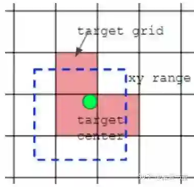 如下图所示,绿点表示该gt bbox中心,现在需要额外考虑其2个最近的邻域网格的anchor也作为该gt bbox的正样本,明显增加了正样本的数量。