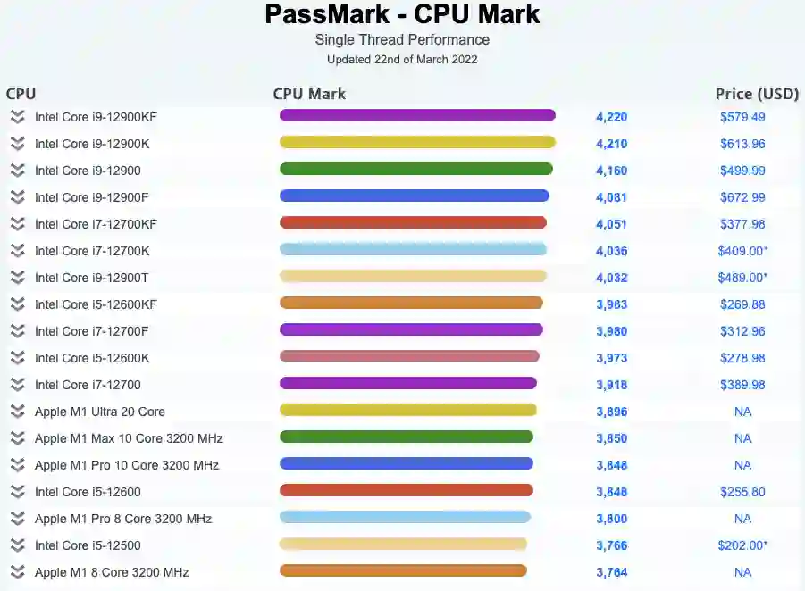 跑分平台 PassMark 今日更新了苹果 M1 Ultra 的跑分信息。在单线程跑分方面,苹果 M1 Ultra 和 M1 Max 和 M1 Pro 几乎相同,为英特尔 i7-12700 水平。多线程跑分方面,20 核的 M1 Ultra 跑分略高于 16 核的 i9-12900K,但不如大部分的工作站处理器,更难以与榜首的 AMD 新款 64 核 Threadripper Pro 5995WX 相比,后者是 M1 Ultra 的 2 倍多。据介绍,PassMark 的 CPU 性能测试会进行八种不同的测试,然后将结果平均在一起。