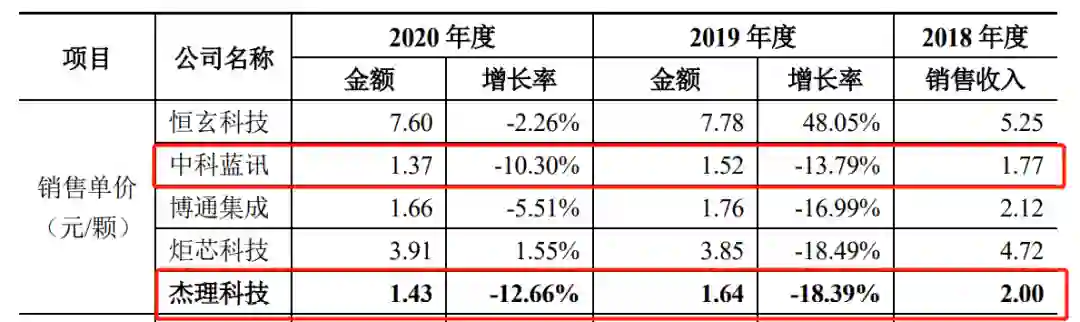 同年,杰理科技与另一家耳机芯片公司中科蓝讯“狭路相逢”,后者已在今年1月21日科创板过会并提交注册。在其他厂商的蓝牙芯片大多还处于10元左右的情况下,两者连续三年降价10%,一道将芯片价格售价降至1.5元区间,卷起价格战血海。最终,两家蓝牙耳机芯片的出货量合计近30亿颗,出货量近乎相当。