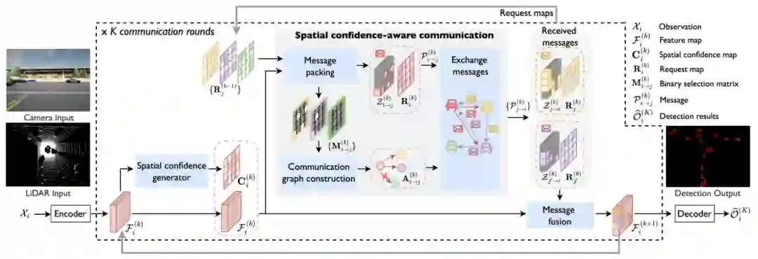 Where2comm 的整体系统包括编码器,空间置信度生成器,空间置信度感知的协作通信,协作信息融合以及检测解码器组成。研究者着重介绍空间置信度生成器,基于空间置信度图的通信以及协作信息融合三个部分。