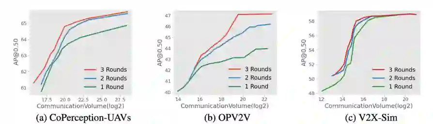 进一步地,他们引入了多轮通信的机制。可以看到增加通信轮数,能稳定地进一步提升感知效果与通信消耗的权衡,保障协作感知系统内的协作者们无后顾之忧地积极参与协作。
