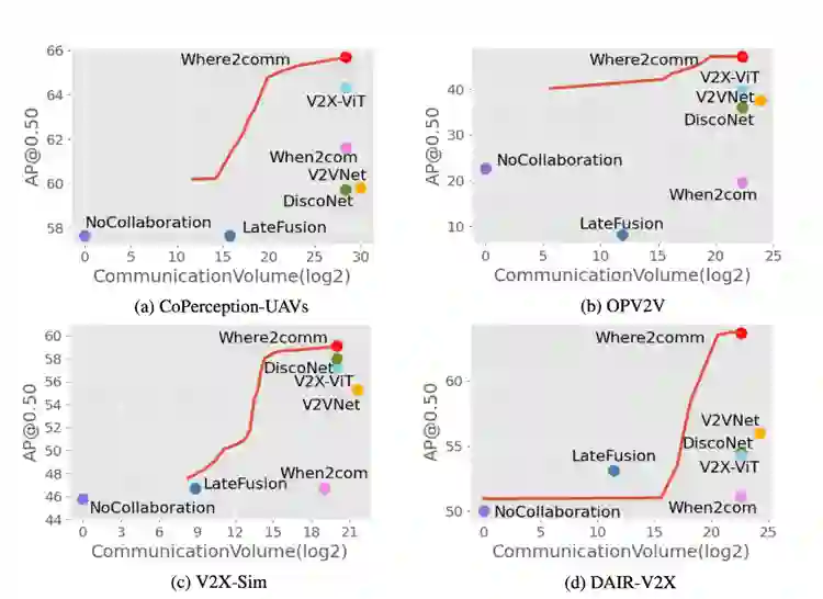 他们发现,为达到同样的探测效果,Where2comm(红线)所需要的通信带宽消耗在CoPerception-UAVs,OPV2V,V2X-SIM,DAIR-V2X四个数据集上分别减少了 5128 倍,十万倍,55 倍,以及 105 倍。