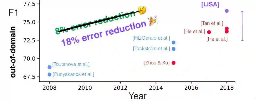 过去十年的 PropBank 语义角色标记。在领域外数据上,Linguistically-Informed Self-Attention (LISA) 方法与其他方法的对比。