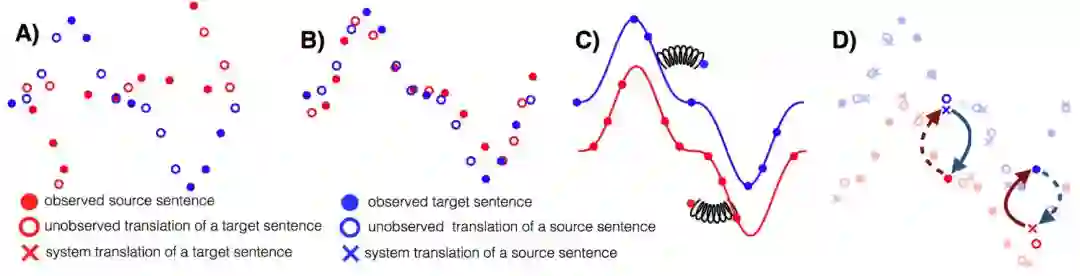 无监督 MT 的三个主要原则:A)两种单语数据集、B)参数初始化、C)语言建模、D)回译。