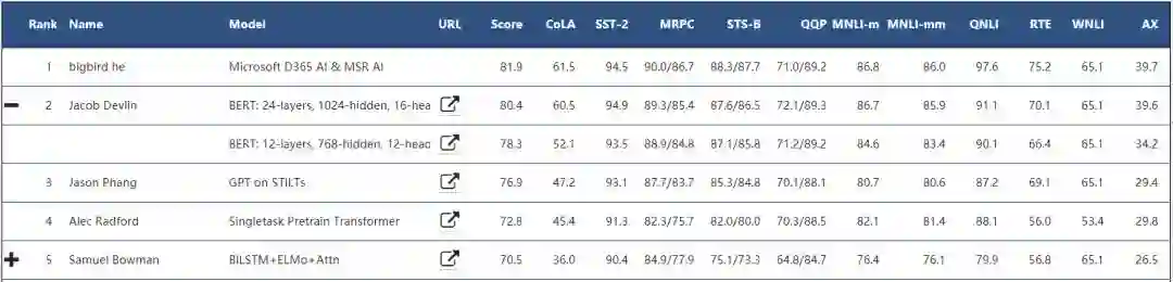 此外,值得注意的是,最近微软发布了一种新的综合性模型,它在 GLUE 的 11 项基准 NLP 任务中的 9 项超过了 BERT,且评分也超过了 BERT。除了准确率外,微软的新模型只有 1.1 亿的参数量,远比 BERT-Large 模型的 3.35 亿参数量少,和 BERT-Base 的参数量一样多。