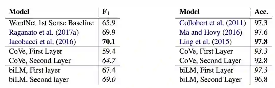 这篇论文提出了广受好评的 ELMo,除了令人印象深刻的实验结果外,最吸引人的就是论文的分析部分,它剔除了各种因素的影响,并对表征所捕获的信息进行了分析。在下图左中语义消歧(WSD)执行得很好,它们都表明语言模型提供的语义消歧和词性标注(POS)表现都接近当前最优水平。