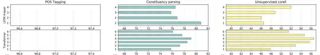 BiLSTM 和 Transformer 的预训练表征的每一层的性能,从左到右依次是:POS 标记、选区解析和无监督共指解析 (Peters et al. 2018 http://aclweb.org/anthology/D18-1179)。