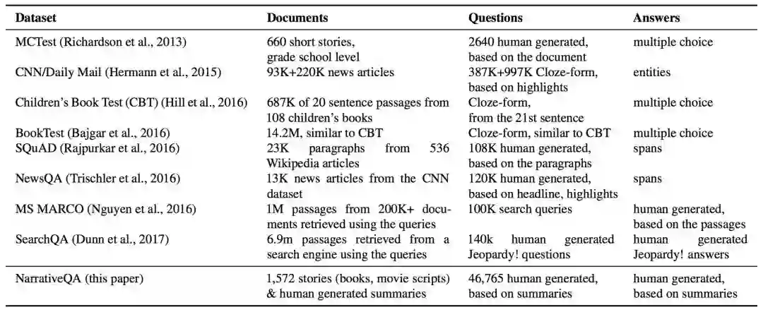 本文作者根据对整个电影剧本和书籍的问答提出了一个颇具挑战性的 QA 数据集。虽然目前的方法仍无法完成这项任务,但模型可以选择使用摘要(而不是整本书)作为上下文,选择答案(而不是生成答案),以及使用 IR 模型的输出。这些变体提高了任务的可行性,使得模型可以逐渐扩展到完整的语境。