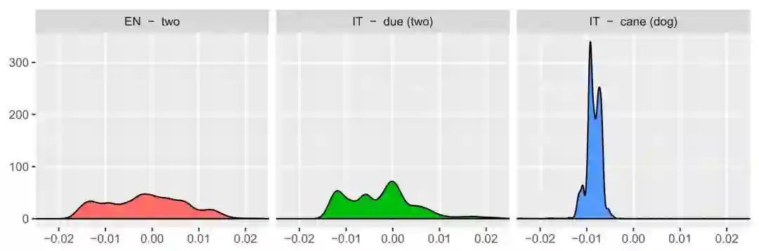 三个单词的相似性分布:与不相关的单词(「two」和「cane」(狗))相比,等效翻译(「two」和「due」)有更加相似的词分布。(Artexte et al. 2018 http://www.aclweb.org/anthology/P18-1073)