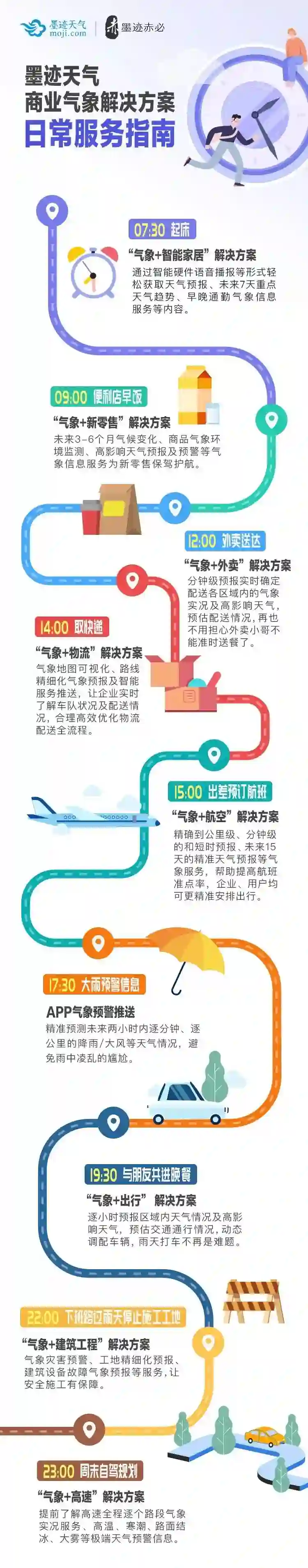 其实不论外卖、物流、航空、高速、新零售还是工程建设,目前都在引入大数据人工智能建模实现路线规划,运力调度,供应链管理,而天气作为一项非常重要的基础变量,建立模型之初需要庞大精准的天气记录数据,模型上线运行需要精准的天气预测数据,每个行业自己收集这些数据不经济也不现实,墨迹天气的服务正好补齐了这个短板。