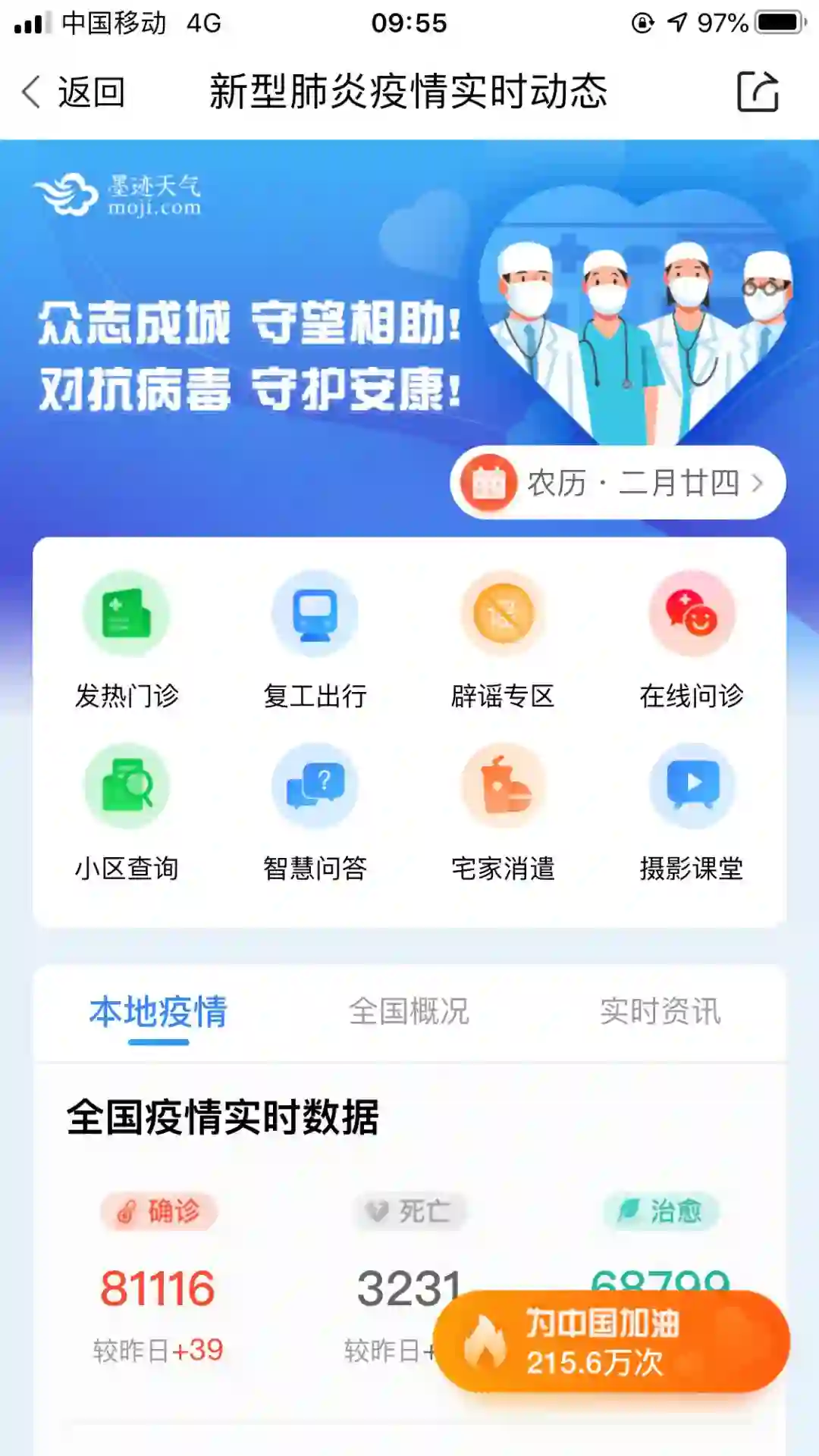 值得一提的是,在做好科技抗“疫”的同时,墨迹天气还通过属地政府捐助百万医疗物资,定向支持防疫工作,为保障一线医务工作者的医护环境安全做出努力。
