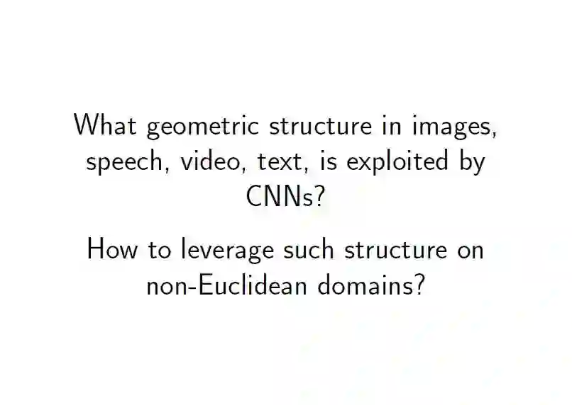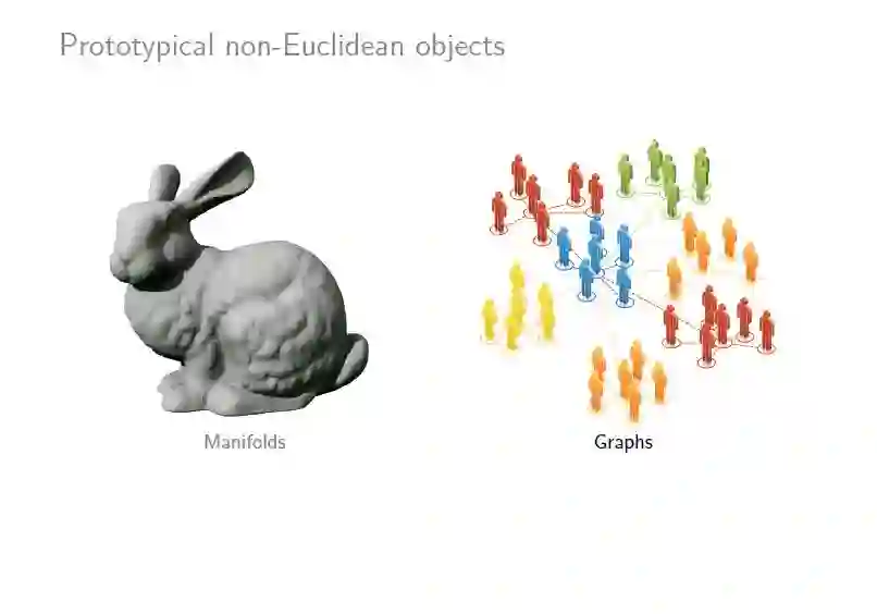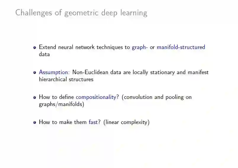 在过去的几年,深度学习方法在多个领域取得了前所未有的成就,比如计算机视觉和语言识别。目前研究者主要将深度学习方法应用于欧氏结构数据,然而有些非常重要的应用需要处理非欧氏空间结构的数据,比如图和流形。这些几何数据在许多任务重的重要性越来越多高,比如3D视觉、传感网络、药品研发、生物医药、推荐系统以及各种web程序。 深度学习在这些方面的应用有着明显的滞后,这是因为处理的对象的非欧性质使得在深层网络中对其基本操作的定义相当麻烦。