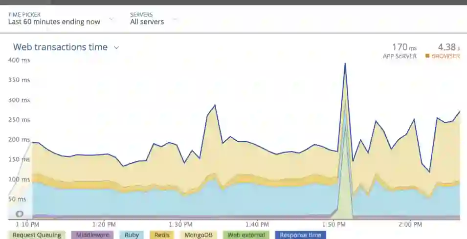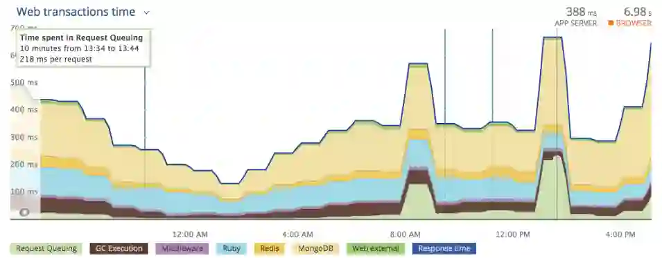 如图所示,New Relic 显示了请求队列时间的一个大峰值。在本例中,这是等待向服务器分配更多资源的时间。