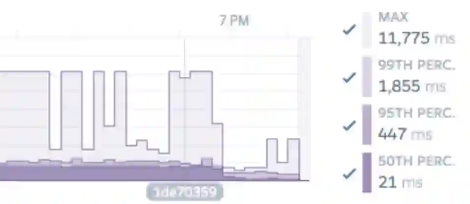 50 个百分位通常低于 100ms,因为许多请求都是能够快速完成的 API 端点。99 个百分位超过 20 秒也没有问题,因为一些管理页面需要好一会儿才能完成。我真正关心的是 95 百分位——我们希望 95% 的请求能够在 3 秒内完成。这 95% 代表了大部分客户的请求和参与,也代表了捐赠者的体验。