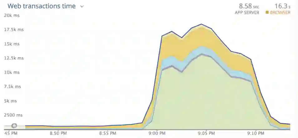 上图说明了所发生的事情——负载的大幅增加使得站点长时间无法使用。随着数据库使用量的增加(黄色区域),每个请求处理的时间也在增加,导致其他请求开始阻塞和排队(淡绿色区域)。