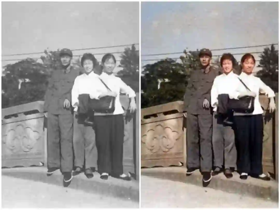 从修复的照片中,我们不仅能看到蓝天白云青青草地,还能看到人物衣服的颜色,甚至能够还原人物的肤色深浅。