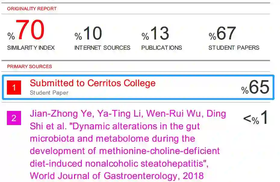 小 s 赶紧看了最新的 Turnitin 检测报告,显示文章居然和一个美国的 Cerritos College 的学生论文相似度 67%。