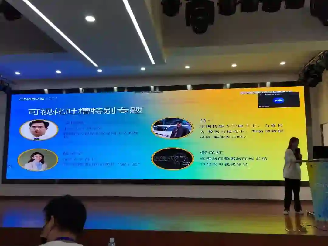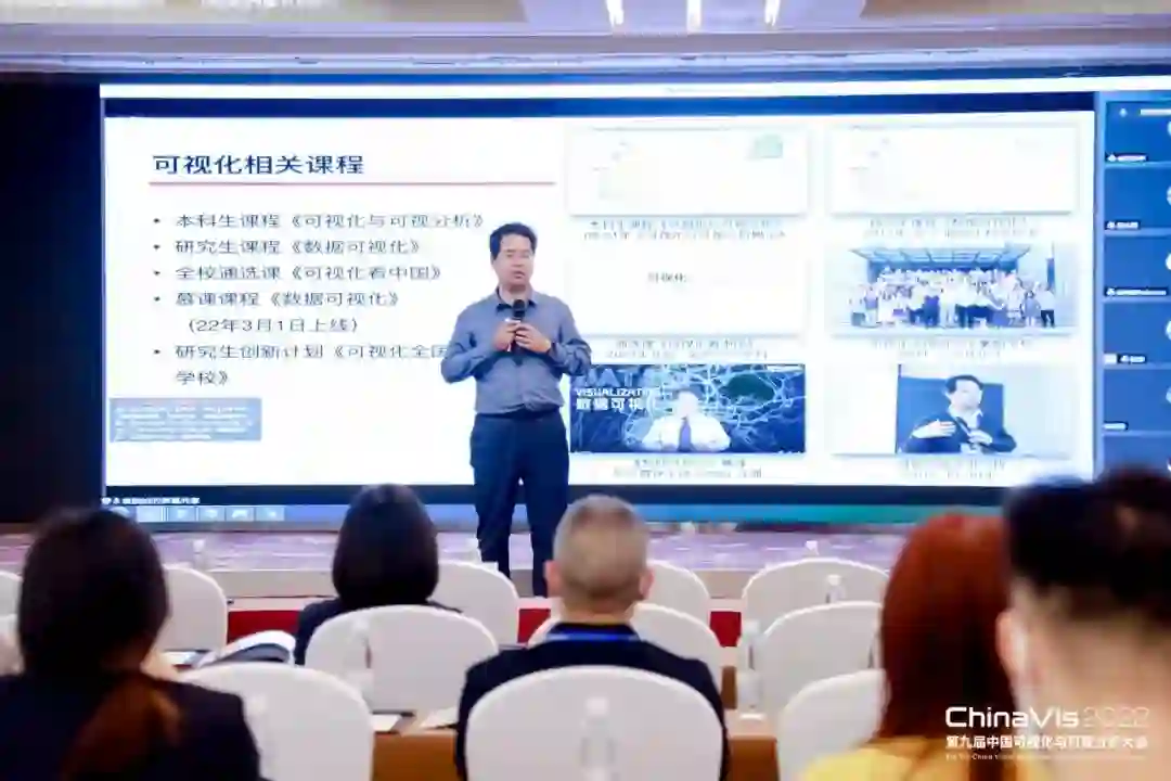 可视化教育专题由来自中国海洋大学的解翠讲师主持,邀请了美国雪城大学徐瑞鸽教授、北京大学袁晓如研究员、清华大学吴琼教授、华东师范大学王长波教授进行专题研讨。徐瑞鸽教授认为在可视化教育的过程中应使数据的视觉表示具有美学上的强大功能,同时具备交流必要的信息,探讨了怎样从艺术家和设计师两个领域获得彼此的基本理解和词汇,有效合作创建多样化和引人注目的数据可视化等方面的研究。袁晓如研究员介绍了推广可视化通识课程建设的重要性,认为可视化作为沟通和表达的桥梁,能够为不同学科背景的学生带来启发;并进一步探讨了如何把可视化从面向计算机专业学生的可视化工具、算法核心等课程内容,演变为面向不同学科背景的数据可视化课程。吴琼教授提出信息图形与可视化不仅是信息表征与传达的方法,也提供了一种思考、解读和处理问题的方式;通过探讨设计思维的本质,即面向解决方案和整合性思考模式及方法,进一步提出设计思维对信息可视化的价值。王长波教授以数据之美为主线,深入探讨了数据可视化课程如何实现技术与艺术交叉、如何结合行业应用案例以及如何有效融入课程思政;认为数据可视化通过培养学生的形象思维与技术水平,可有效提升学生的审美能力及实践能力。