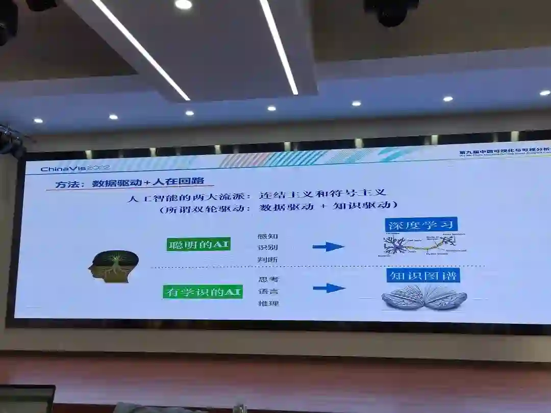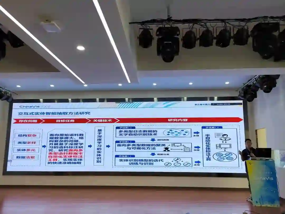 论文报告Session 2 “AI4VIS”中,报告嘉宾分别报道了4项相关研究工作。浙江大学的学者提出基于深度学习的框架来自动发现视觉洞察并为图表生成相应的文本描述,开发了一个交互系统用于显示图表见解以及相关描述。东北师范大学的学者介绍了一种辍学行为的模式识别方法,可以定量地揭示不同学习行为对于辍学的影响。天津大学的学者分享了一种用于构建大数据可视化系统的混合预测和搜索方法,以灵活和高效地探索投标数据。重庆大学的学者提出通过深度嵌入和视觉探索对时间序列数据进行呈现和分析,在不同的数据集量化实验和可视分析案例研究评估得到较好的效果。