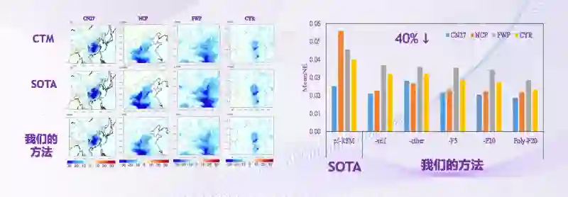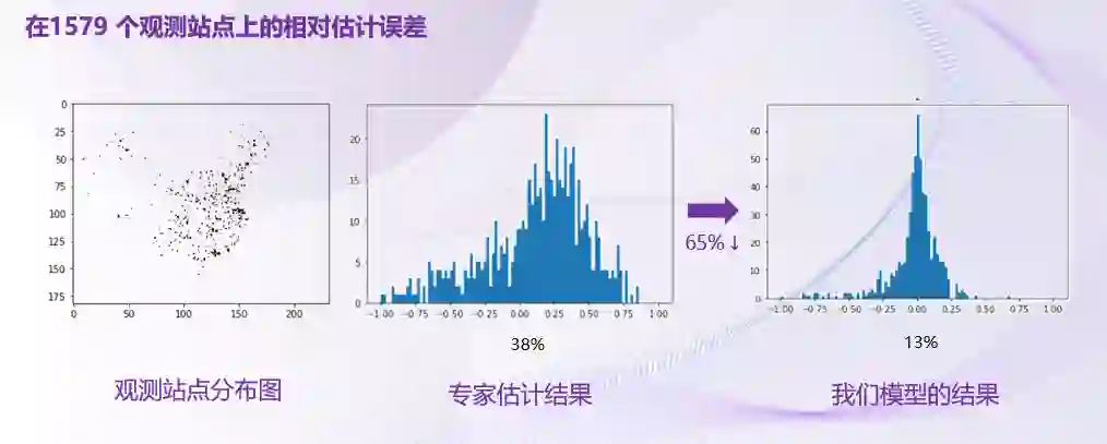 在过去的一年,我们与清华大学的科学家一起,基于1500个观测站点的排放数据,评测了排放估计模型。实验表明,相比之前的专家估计,机器学习模型不仅节省了大量的人力成本,还把相对的估计误差降低了65%,极大提升了排放清单估计模型的精度。
