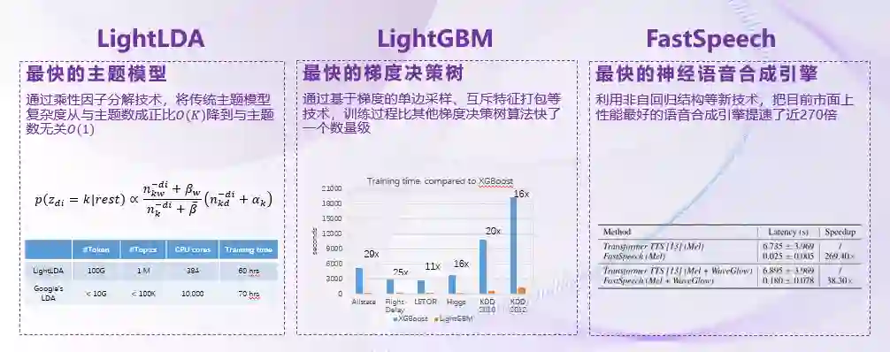 这些新技术因为低功耗、高效率,或是可以在同样时间内训练出性能更好的机器学习模型,已经应用于微软的多个产品中,也受到了外界的广泛关注。LightLDA 模型为必应搜索引擎的上下文广告提供了精细匹配的支持,增加了广告拍卖的密度;LightGBM 算法极大程度上推进了人工智能算法的平民化,受到了 GitHub 社区的青睐,同时也是必应搜索引擎后台的核心技术之一;FastSpeech 算法在微软 Azure 的认知服务中支持15种语言的语音合成,也是市场上语音处理开源软件的主流技术。