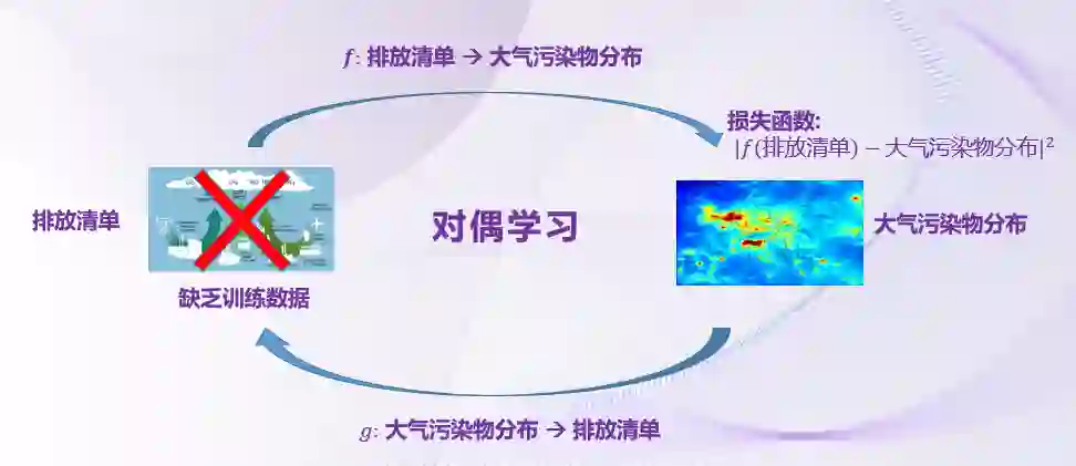 我们注意到,这个问题的背后有一个反向问题,我们可以从排放清单出发,通过推演获得大气中污染物的分布,这个问题的难度则要低得多。这里刚好可以用到微软亚洲研究院近年来所提出的“对偶学习”思想。利用对偶学习,从大气污染物分布出发,经过排放清单,再回到大气污染物分布,形成学习闭环,我们就可以利用对大气污染物预测的误差,来驱动整个学习过程,最终获得排放清单估计模型。
