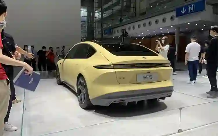 侧面来看,新车与 ET7 一样,采用了溜背短尾的造型,符合其轿跑的身份,并且进一步提升了车辆的运动感。车尾部分,新车采用了贯穿式尾灯设计,并一直延伸到量产,带来了视觉上的延展效果。据悉,新车将提供 9 种车身配色,车展现场展示了云初黄配色,是其专属配色之一。