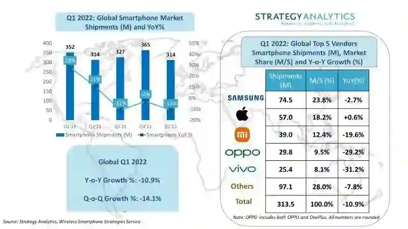 就在上个月,Strategy Analytics 报告称,三星在全球智能手机市场占有 24% 的份额,这是该公司五年来第一季度表现最高的。但与此同时,智能手机出货量同比下降了 11%。在该报告中,Strategy Analytics 的一位总监解释道:“ 大部分的成功要归功于 Galaxy S22 的发布。”