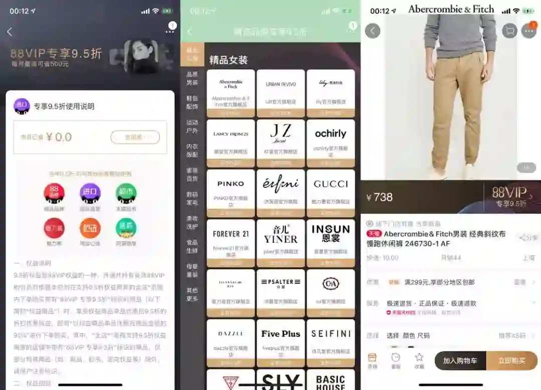 既是淘宝的会员,购物权益自然是不能少的。88 会员可享受 88 个天猫精选品牌、天猫超市以及国际直营全店 9.5 折,这一权益是可以与其他活动叠加使用的。这相比于京东需要抢兑而且还时不时失灵的全品类券,可用性似乎更强一些。不过 88 个精选品牌覆盖面其实非常有限,我半年在淘宝花费 2W+,可此项权益才为我节省了不足 20 元。