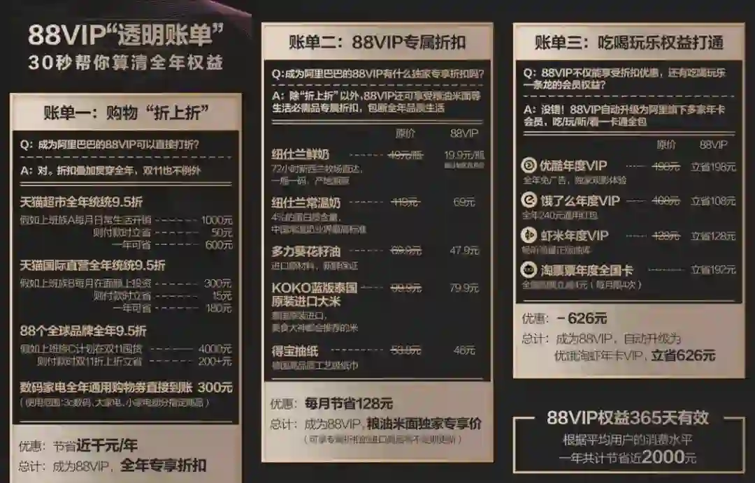 尽管淘宝将「88 VIP」吹得天花乱坠,号称一年可以为用户节省 2000 元,但我们都清楚这一数值「水分」很大。倒不是一定是有所欺诈,更普遍的情况是我们不会用尽所有权益。88 会员权益主要分为两大类,「淘宝购物折扣」和「阿里系应用年费权益」。