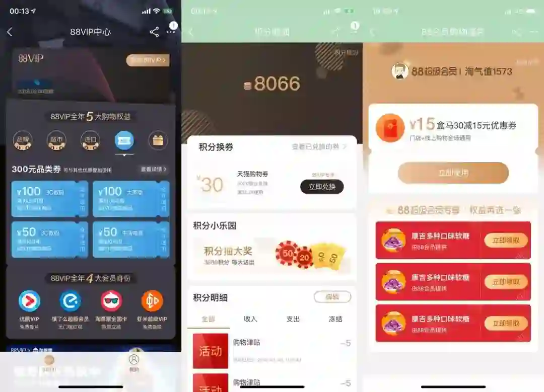 此外,88 会员还支持用天猫积分兑换一些面额相对较大的天猫购物券,这个券在天猫是通用的。去年底曾支持 5000 积分兑换 50 元购物券,目前仅剩 3000 积分兑换 30 元这一选项。这一权益在年底积分清零前,用作消耗积分的手段,倒是还不错。