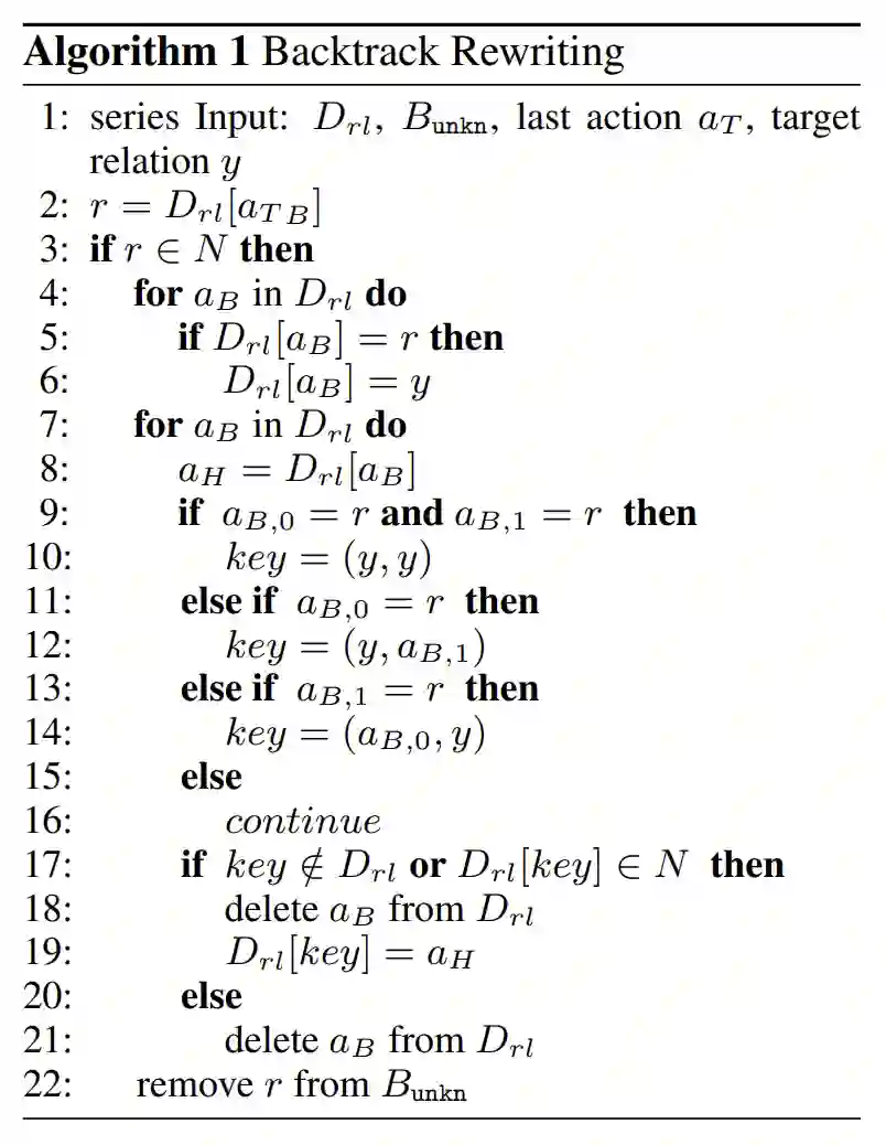 在训练中,当一个 episode 结束时,检查最终得到的关系是否和数据中的答案一致,若不一致,则需要根据答案更新记忆区,更新方法如下算法 1 所示。举例来说,如果模型给出要预测的关系是一个 invented 关系 u,而实际训练数据指向一个已知的关系 r6,则记忆区中的所有 u 都会被替换为 r6,下次再查找的时候,模型就知道这条规则的关系组合应该被合并为 r6。