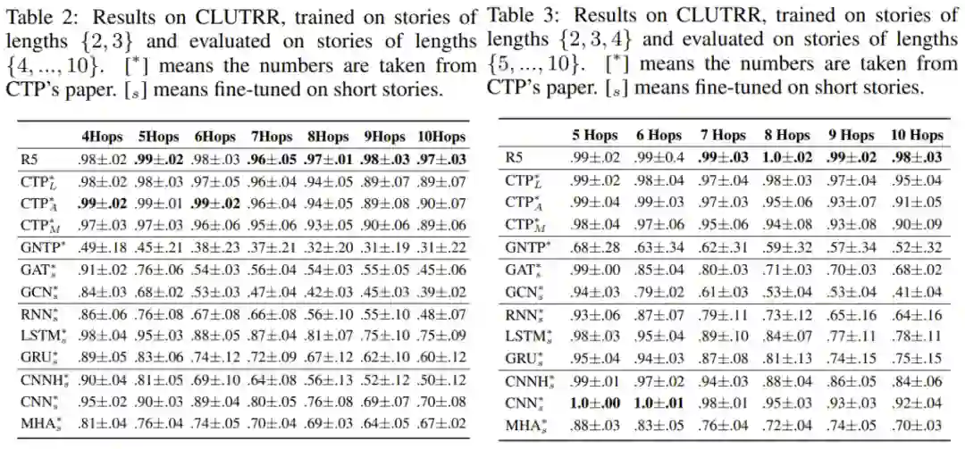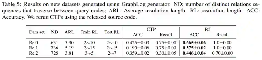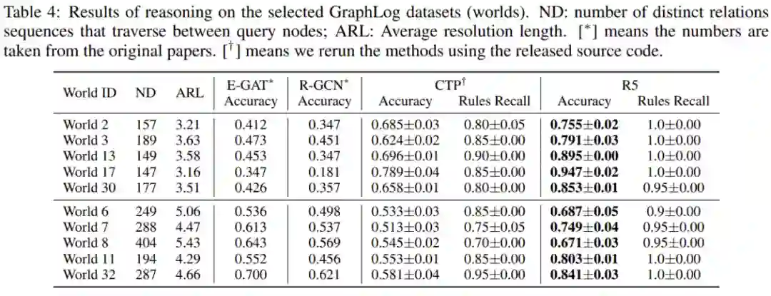 在 CLUTRR 和 GraphLog 数据集上,R5 均取得了 SOTA 的表现,其中 CLUTRR 的数据较为干净,而 GraphLog 则包含较多错误数据。可以看到,R5 可以在非常小的数据上进行训练(每张图仅包含 2~4 个 node),却可以将学习到的规则泛化到较大的图上,它们的推理路径可能长达 15 步。值得一提的是,GraphLog 数据集给出了生成每个小数据集所用到的规则,虽然在训练时不使用这些信息,但可以用其验证模型对规则提取的召回率,R5 在大部分实验的数据集上可达到接近 100% 的召回率。
