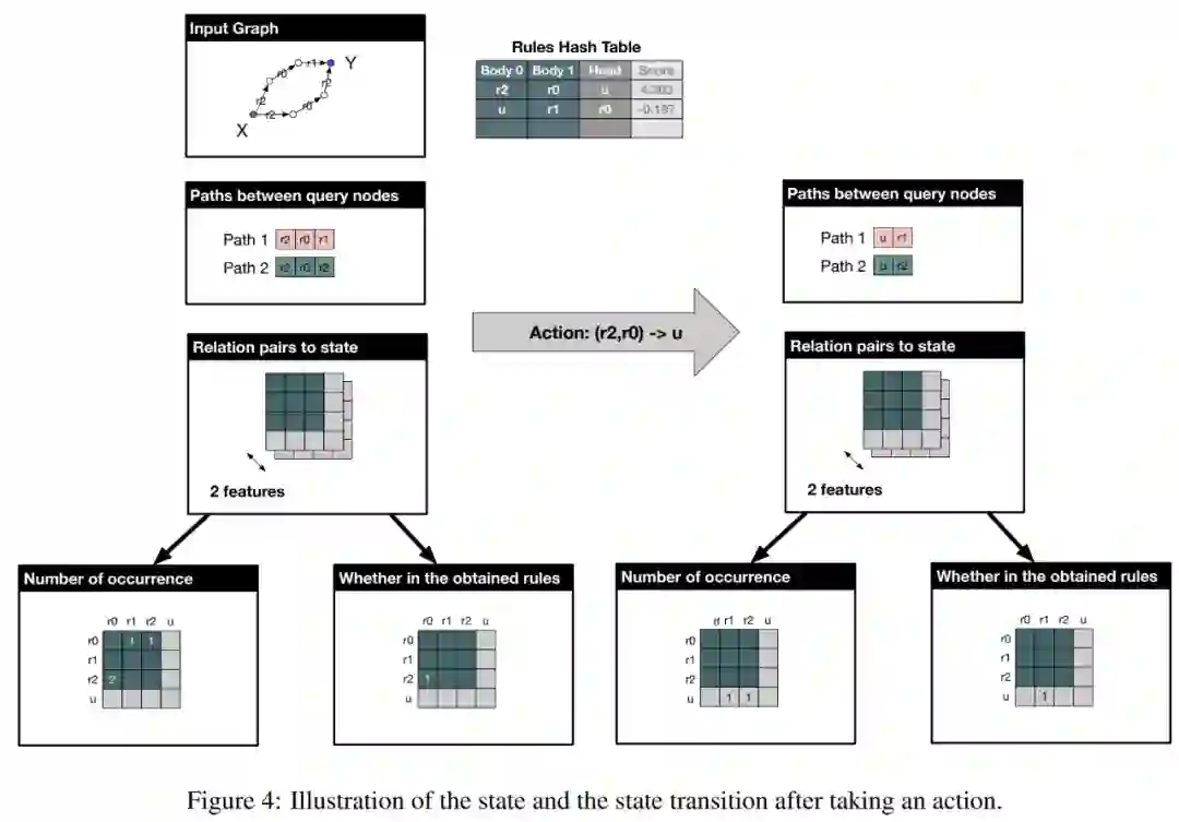 Action:本文的 action 是在 path 中合并相连的两个关系,并将其合并为一个新的关系。比如在上图中,第一步 action 为将 (r1,r2) 合并为 r3,第二步为将 (r5,r3) 合并为 r21。迭代地执行这样的操作,直至 query (X,Y) 之间得到一个单独的关系,则将其作为对 (X,Y) 之间的关系预测;