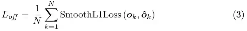 其中ok为偏移,xk,nk为第k个角在原图的坐标。网络分别为为所有类别的左上角和右下角各输出一组预测偏移,仅有正样本点有损失,损失函数为smooth L1: