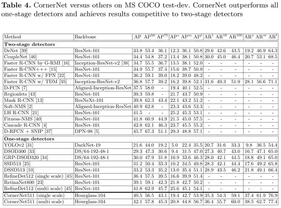 CornerNet使用多尺度预测,在COCO数据集上的AP为42.1%,优于其他one-stage检测器。
