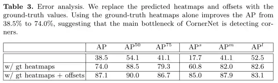误差分析 网络同时预测了热图,偏移和嵌入向量。每一项都会影响检测精度。通过用ground truth热图和偏移替换预测值来评估每部分的误差。