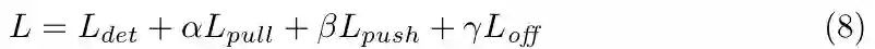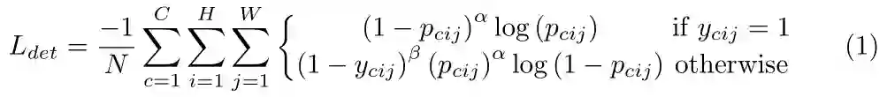 记pcij为类别c在热图(i,j)位置上的得分,ycij为带有高斯函数的ground truth热图,检测的损失函数基于Focal Loss:
