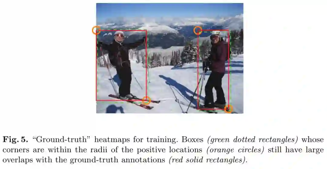 网络预测两组热图,每组热图的通道数为C,C为目标类别数,不包含背景,大小为H×W。每一个通道是一个二进制掩码,表示一个类别的角的位置。 对于每个角,只有一个点为ground truth,其他位置的点都为负样本。在预测时,预测的角的位置稍有偏差,其bbox与ground truth的IoU通常也会很大,如下图所示: